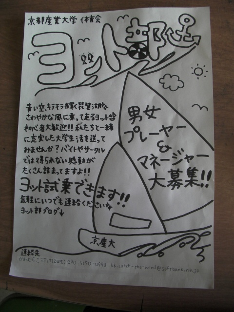 京産大ヨット部では随時部員を募集しています!!男女プレーヤー&マネージャー、1回生はもちろんのこと2回生でも大歓迎!!気軽に連絡ください!待ってま~す(*^^)v
